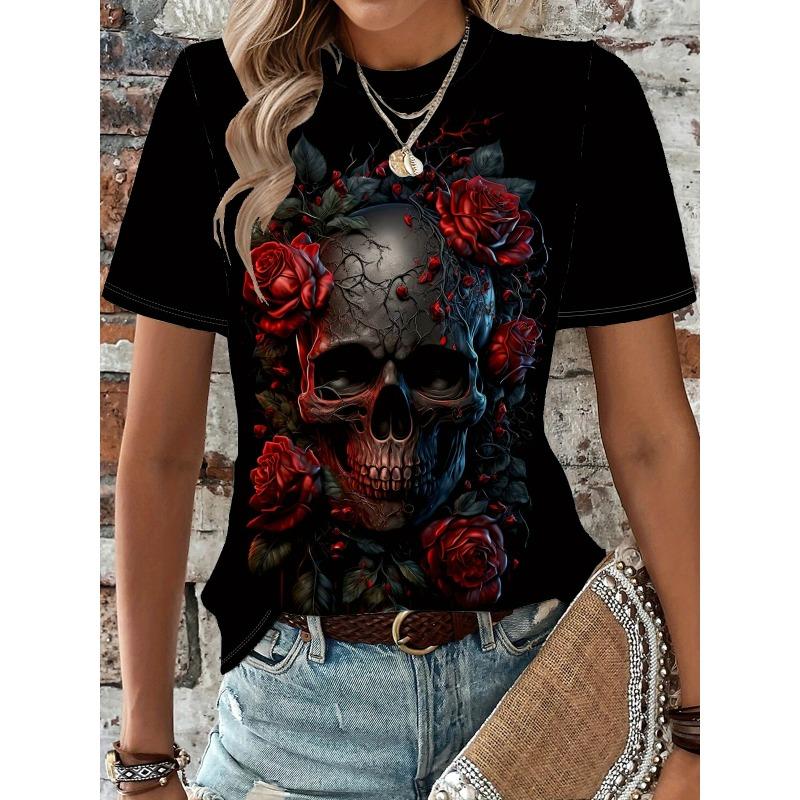 Dámské tričko s potiskem lebky a růže - Pohodlné s krátkým rukávem a kulatým výstřihem, Módní design vzoru, 3D potisk - Ideální pro jarní a podzimní neformální nošení