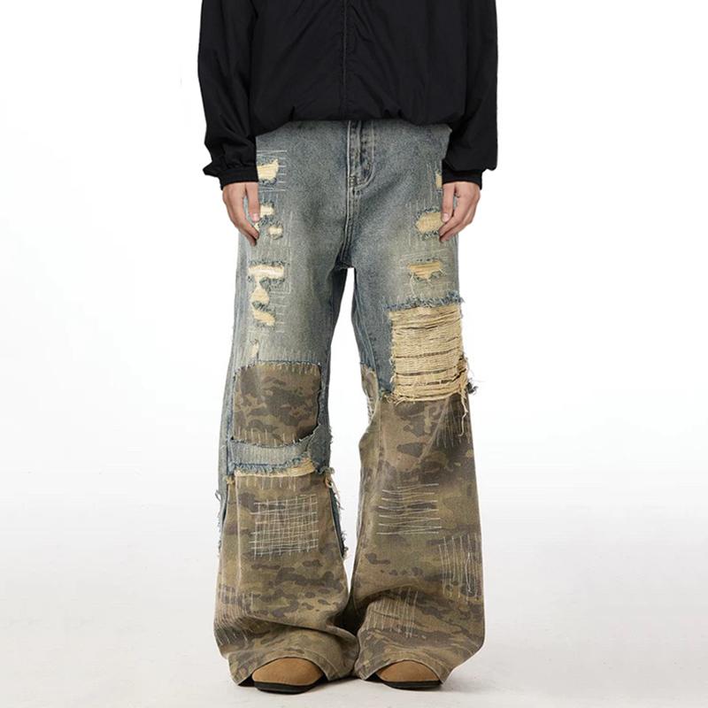 BeatStreet High Street Džíny pro muže a ženy Výšivka Crewel Kamufláž Patchwork Design s dírami Niche Praní Volné Džínové kalhoty Nové