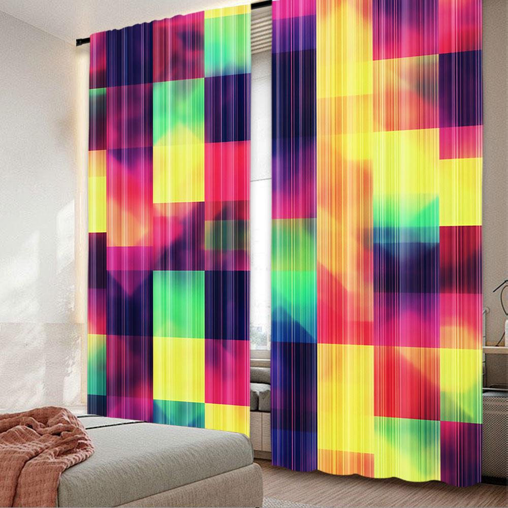 2Pcs Abstract Curtains Rainbow Colored Geometric Square Shaped Blurry Effects Watercolor Design For Bedroom Bathroom Living Room