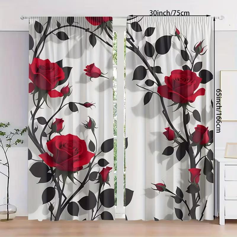 2PC Red Rose Branch Curtains Bold Floral Print Light Filtering Drapes Modern Window Curtains for Bedroom Living Room