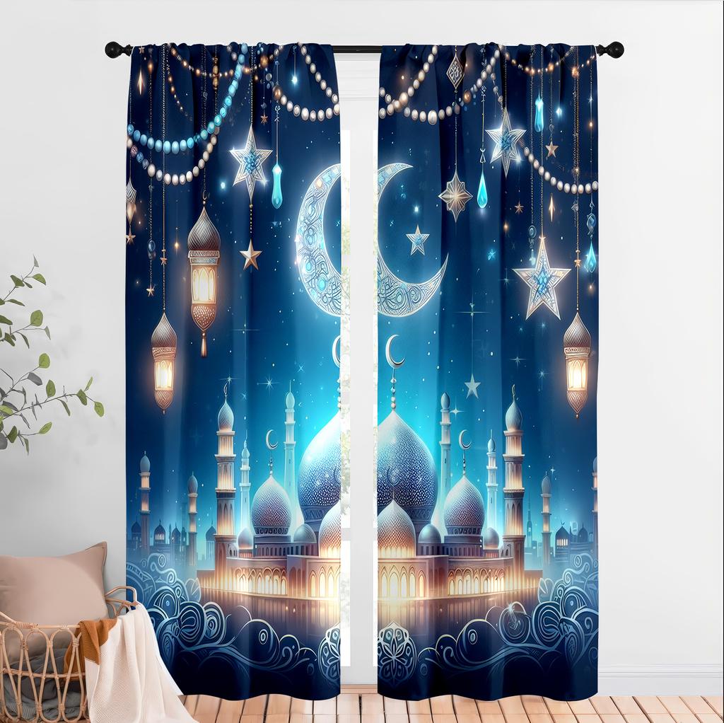 2 ks Očarující mešita a lucerna noční závěsy Ideální pro dekoraci oken na Ramadan/Eid Elegantní dekorace obývacího pokoje/ložnice