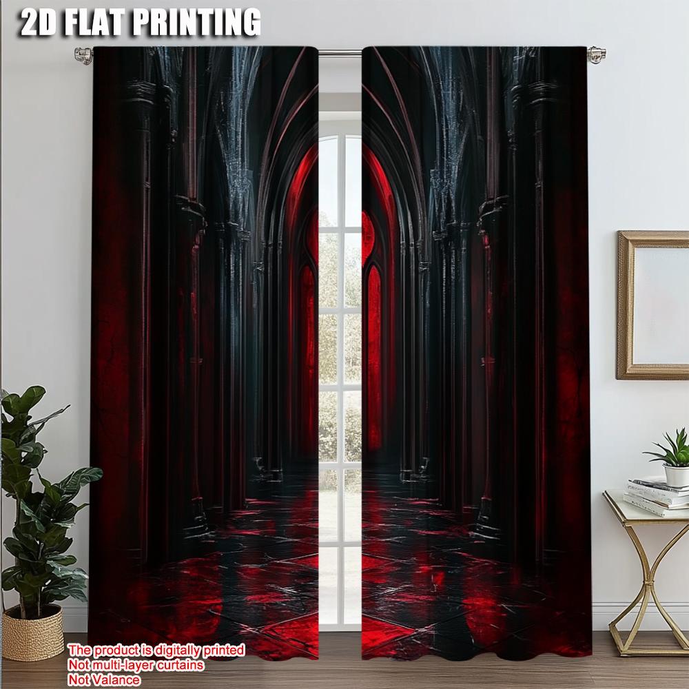 2pcs Fashionable Curtains 2D print Gothic Archway Black and Red Machine Washable (without rod) Thermal Insulation and Room