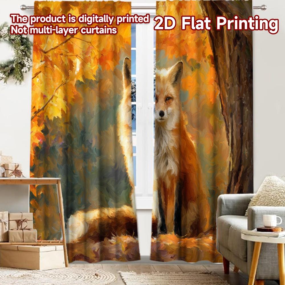 2pcs 2D FLAT PRINTING Curtains (Without Rod) Autumn Fox Scene Chic Print Curtains Festival Durable Polyester Curtains Thermal