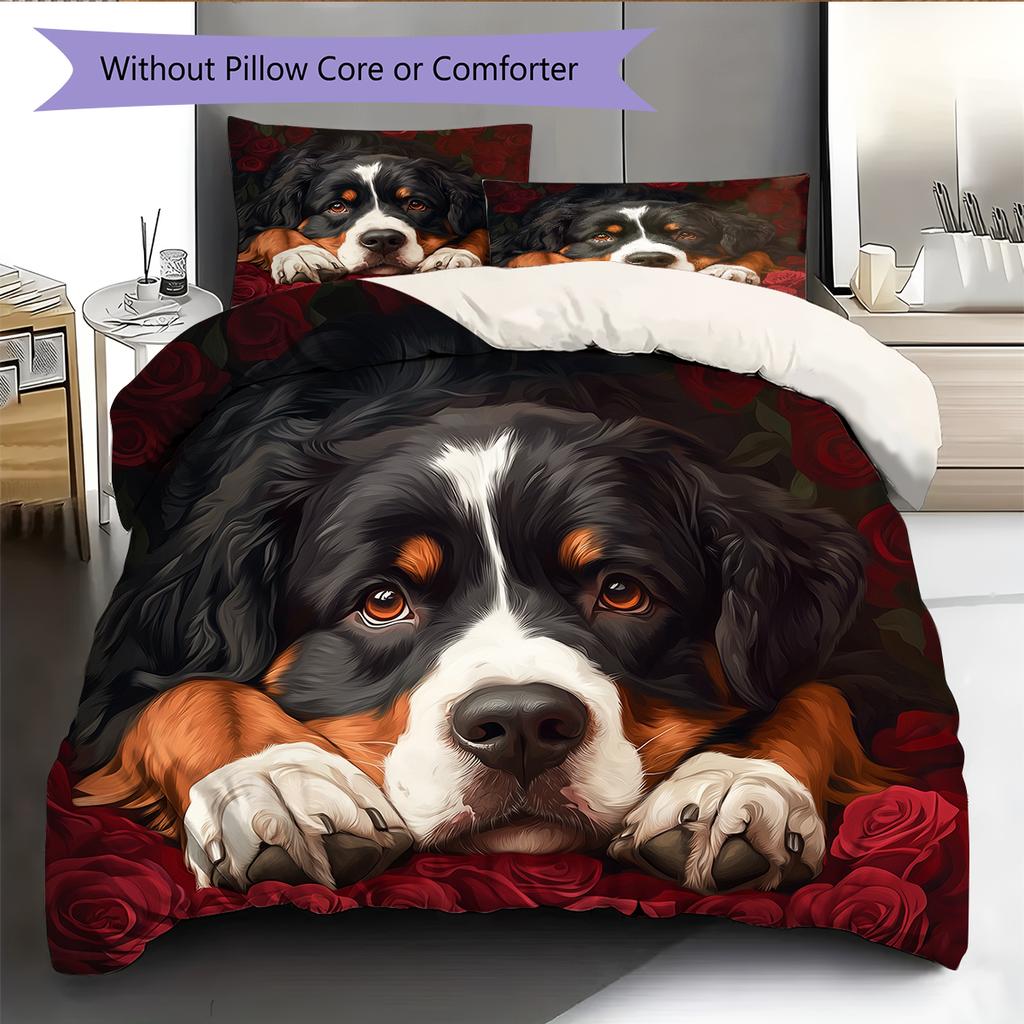 Bernese Mountain Dog and Rose Pattern Bedding Home Decoration Birthday Gift (1 * duvet cover + 2 * pillowcase, without core)