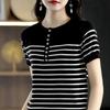 Striped Round Neck Eight-button Knitted Short-sleeved Womens Summer Breathable Sweat-absorbing T-shirt Comfortable Fit and Simple Versatile Top