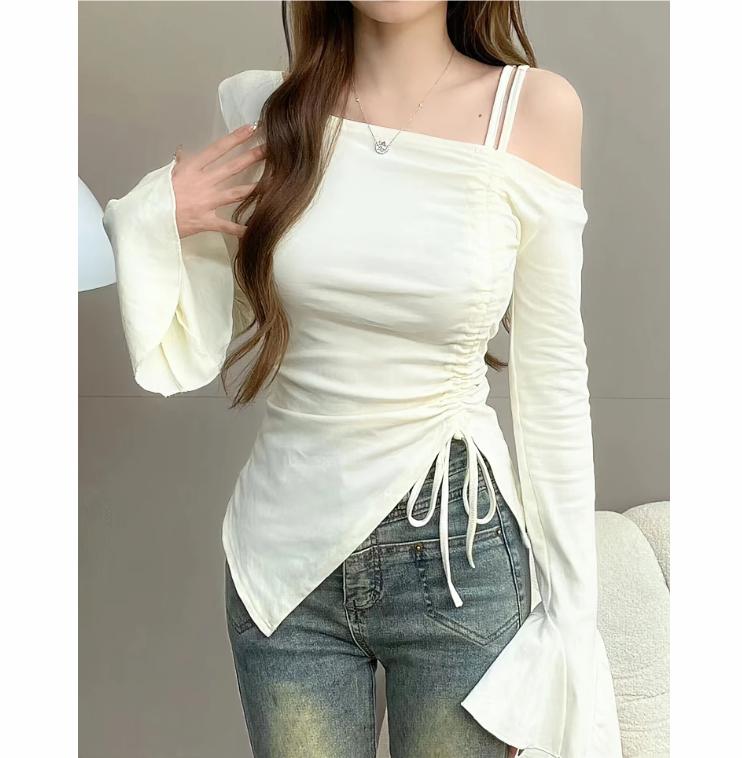 Sweet Sexy Drawstring Ribbon White Off Shoulder Top Women Basic Long Sleeve Body T-Shirt Elegant Flare Sleeve Lady Tees Pulovers