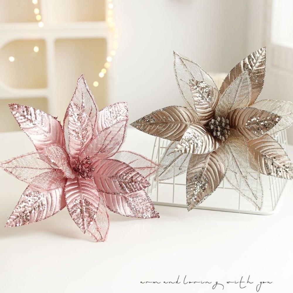 New 29CM Artificial Poinsettia Flower Glitter Sparkling Christmas Glitter Flower Sequins Simulation Flowers Christmas Decoration