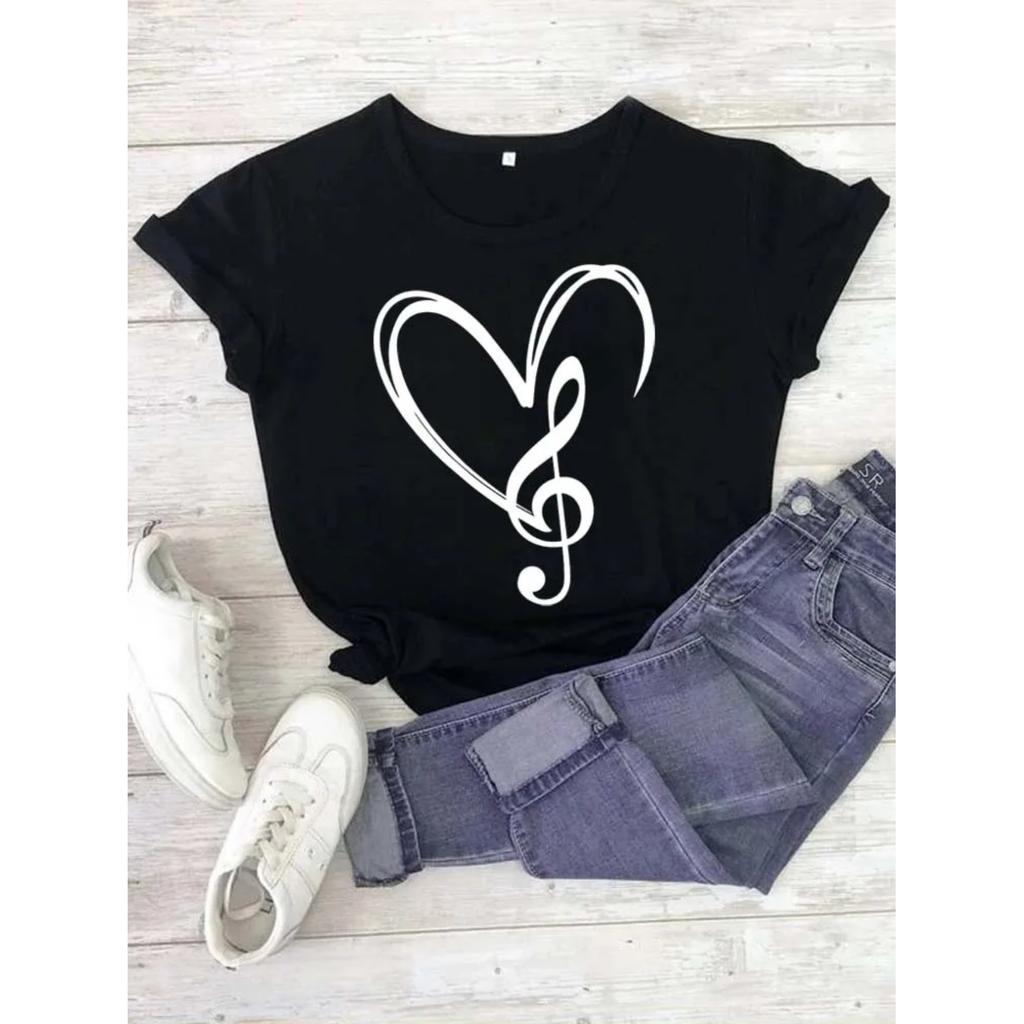 Fashion Women T Shirt Musical Note Printed T Shirt Casual Black Tops 90s Ladies Girls Tee Shirt Female Harajuku Graphic T-shirt