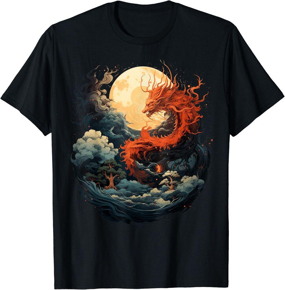 Japanese Aesthetic Dragon Waves Moon Vintage T-shirt Size S-5XL Unisex T-Shirt
