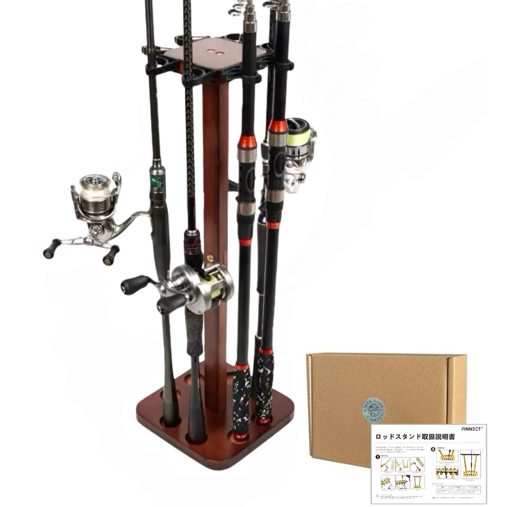 FINNECT Wooden Rod Stand, 8-Piece Set, Assembled, Natural Wood, Holds 8 Rods, Fishing Tackle Storage, Easy to Use, Walnut Color