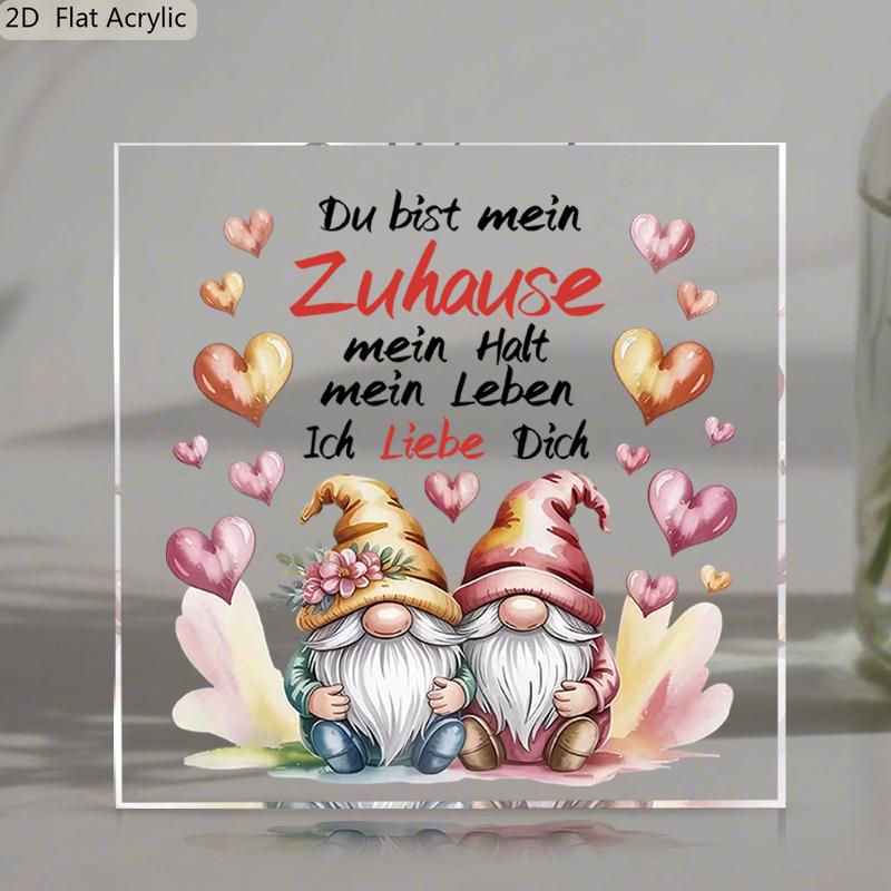 2D Flat, "Du Bist Mein" Heart-Shaped Gnome Acrylic Desktop Decoration Plaque, Suitable for wall Decoration, porch, Room, Villa, accents Home, Hallway,