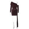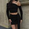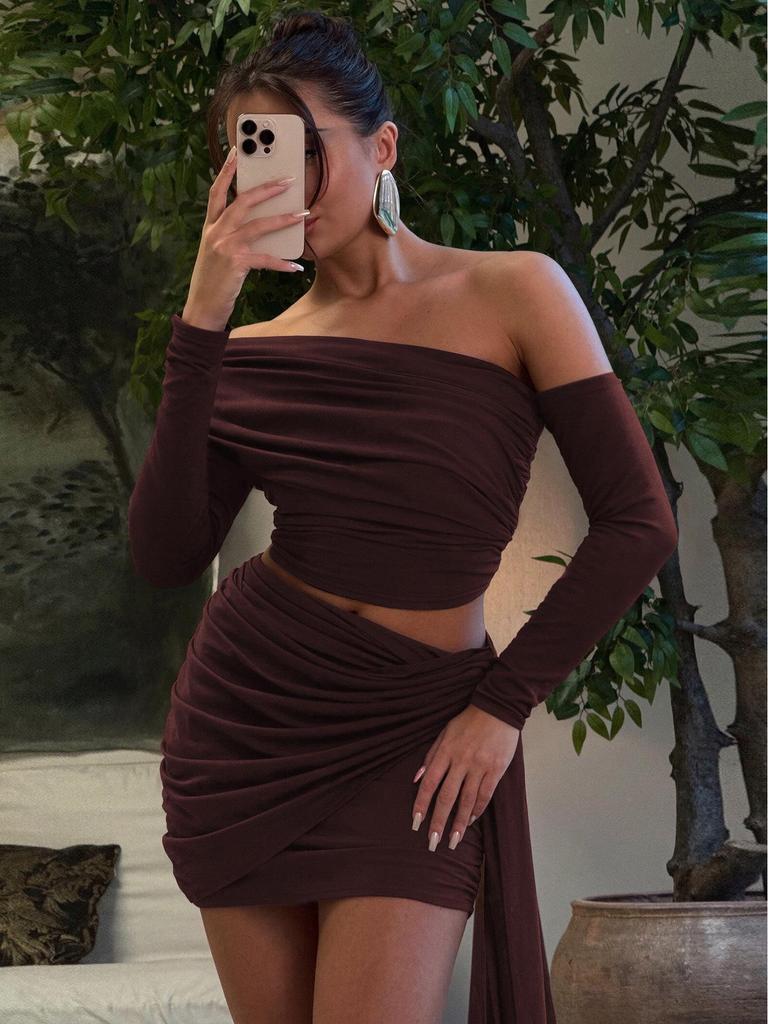 Embrace a chic and elegant style with this stunning women's ensemble, perfect for autumn. The set includes a sophisticated one-shoulder long-sleeve top and a matching hip-hugging short skirt, both designed to flatter your silhouette. The top features a slimming ruched ribbon detail, adding a touch of refined femininity. Made from soft, luxurious artificial silk material with a hint of milk silk fur, this solid-patterned set offers both comfort and style. Ideal for a stylish night out or an upscale event, this fashion-forward set ensures you stand out with grace and confidence.