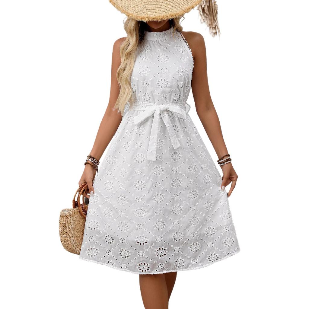 2026 Jaro/Léto Éterické Bílé Vyšívané Elegantní Dámské Šaty s Vysokým Pasem Měkký Tílkový Výstřih s Páskem v Pasu Šaty