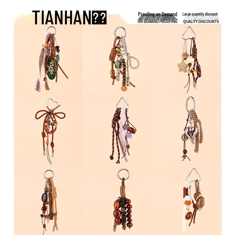Vintage Miu Styl Přírodní Dřevěný Korálek Pletený Klíčenka Taška Přívěsek & Auto Přívěsek