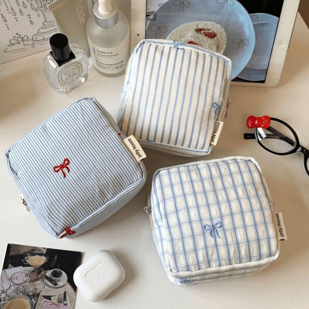 Striped Plaid Mini Makeup Bag Embroidered Multi-functional Lipstick Storage Pouch Zipper Closure Square Shape Cosmetic Bag