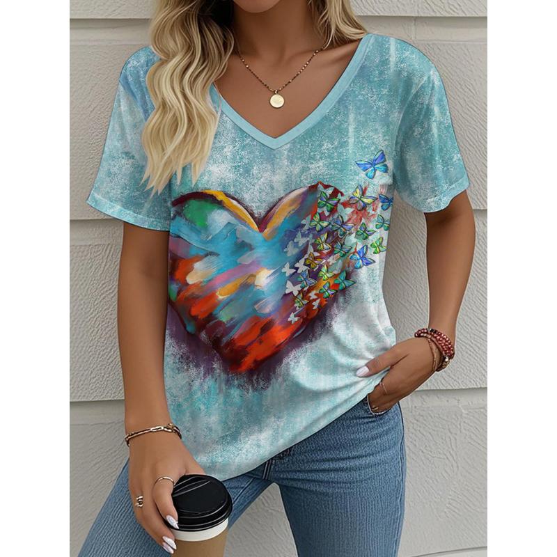 Summer Women's T-Shirt Love Printing Outdoor Retro Fashion Casual Oversized V-Neck Short-Sleeved Women's Clothing
