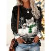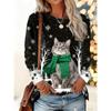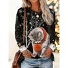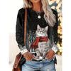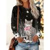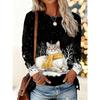 Christmas-themed women's snowflake and kitten print round neck long-sleeved T-shirt, festive black and white casual loose top