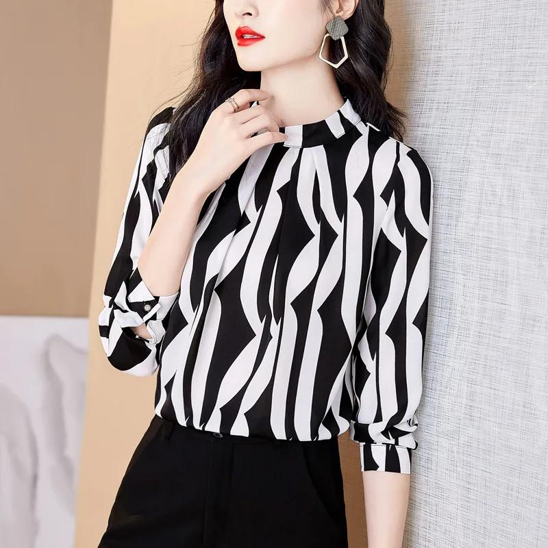 Women's New Tops Fashionable Slimming Striped Thin Pullover Stand-up Collar Long-sleeved Shirts