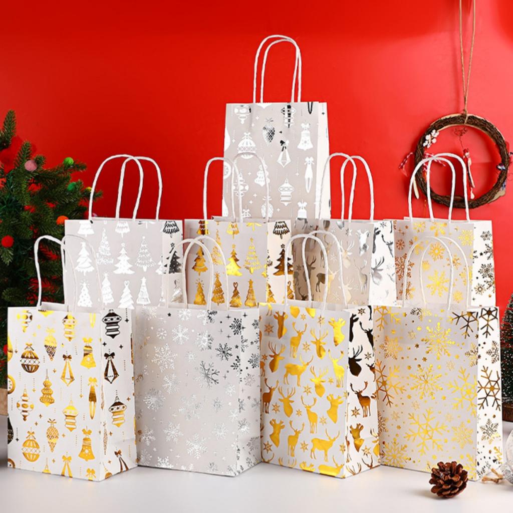 Christmas White Kraft Gift Bag with Gold Silver Snowflake, Bell, Christmas Tree, Reindeer Pattern Holiday Party Gift