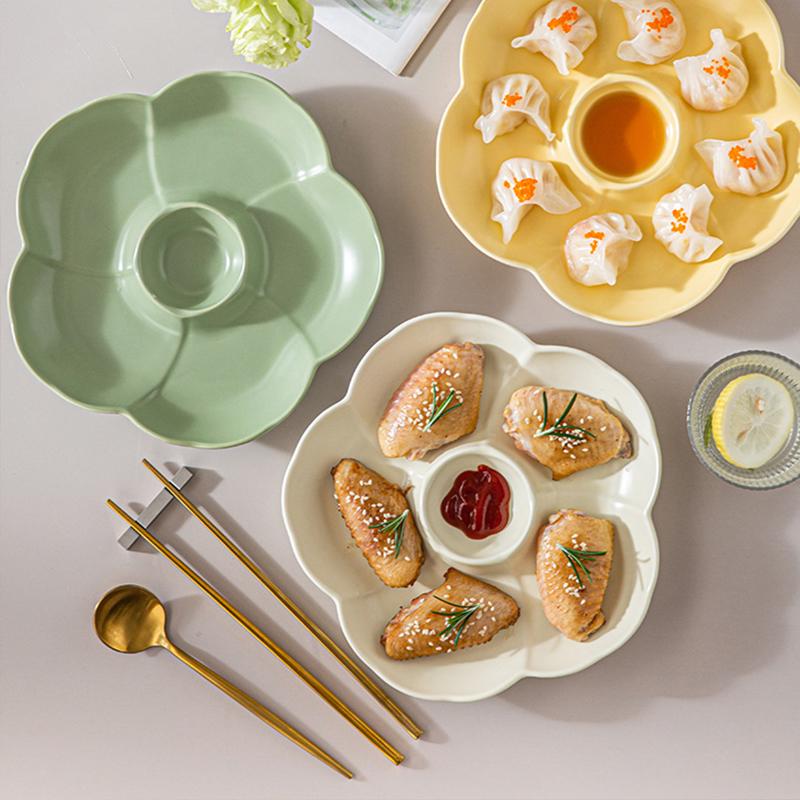 Ceramic Dividing Dumpling Plates New Household 8.5 Inch Flower Shape Kitchen Tableware with Sauce Dish Underglazed Colour Plate