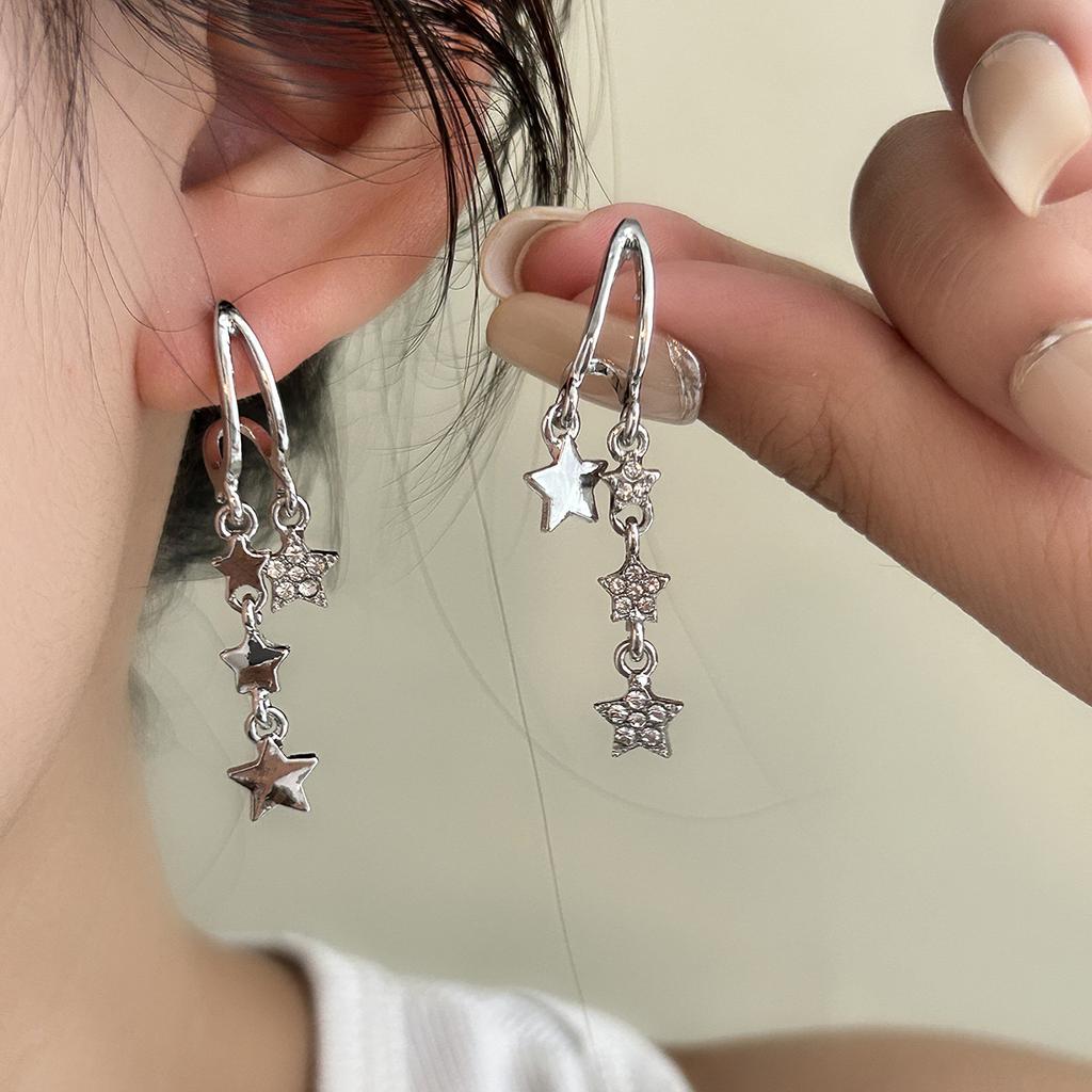 Light Luxury Long Diamond-Encrusted Five-Pointed Star Stud Earrings Temperament Niche Design Earrings High-End Flash Diamond Fringed Earrings