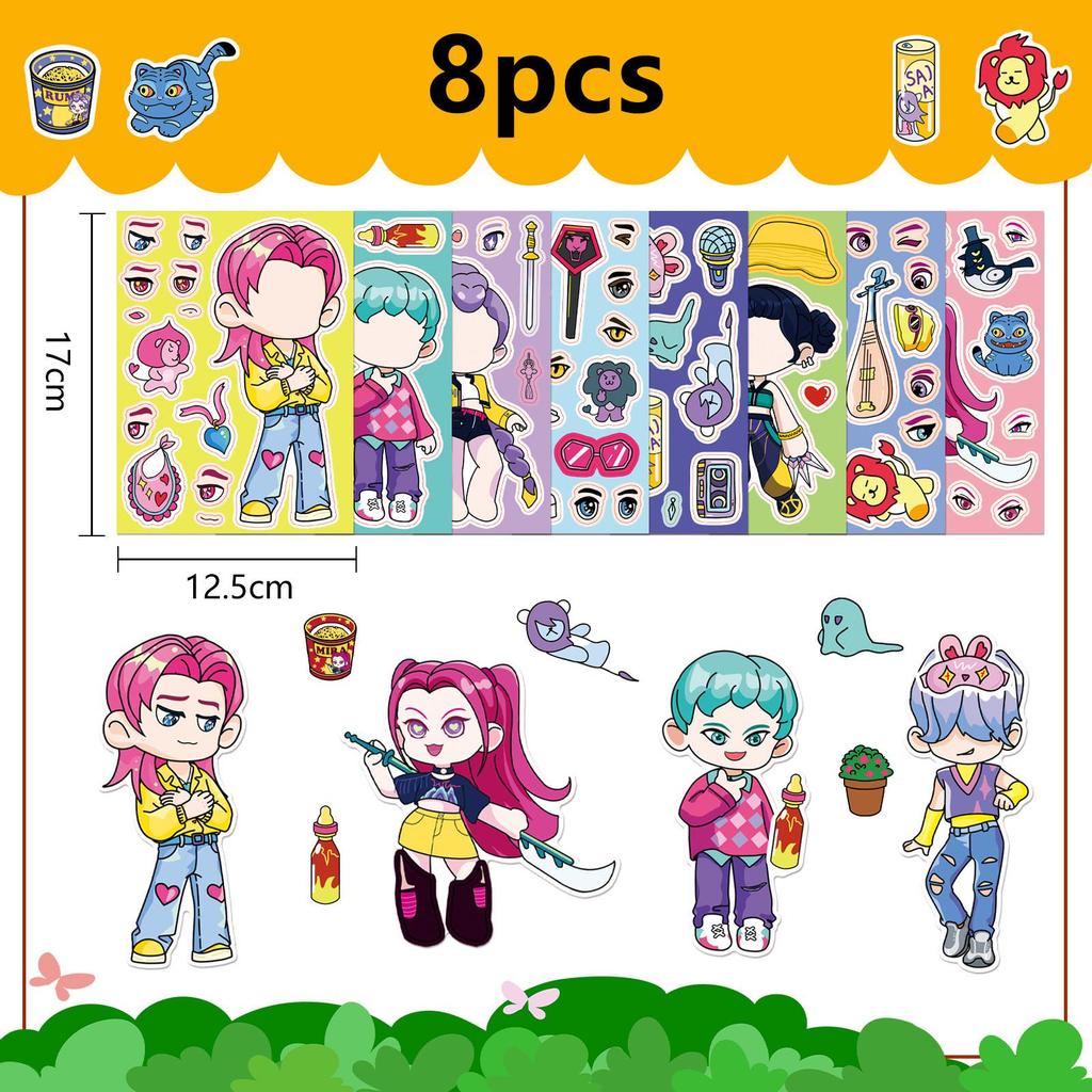 Bring the exciting world of K-pop Demon Hunter to life with this fun 8-piece sticker set! Featuring vibrant cartoon and anime-style designs, these interactive stickers let you mix and match facial features to create your own unique Demon Hunter expressions. Perfect for personalizing your belongings, they are ideal for decorating laptops, notebooks, helmets, luggage, school supplies, and more. Made from high-quality vinyl, these stickers are durable, waterproof, and easy to apply and remove without leaving residue. Whether you're a K-pop fan, an anime enthusiast, or simply love creative DIY projects, this sticker set adds a playful and stylish touch to your everyday items.