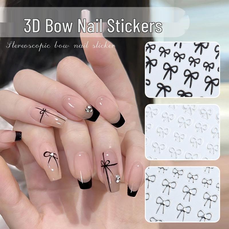 3D Bowknot Nail Stickers: Black, White & Silver Self-Adhesive Decals