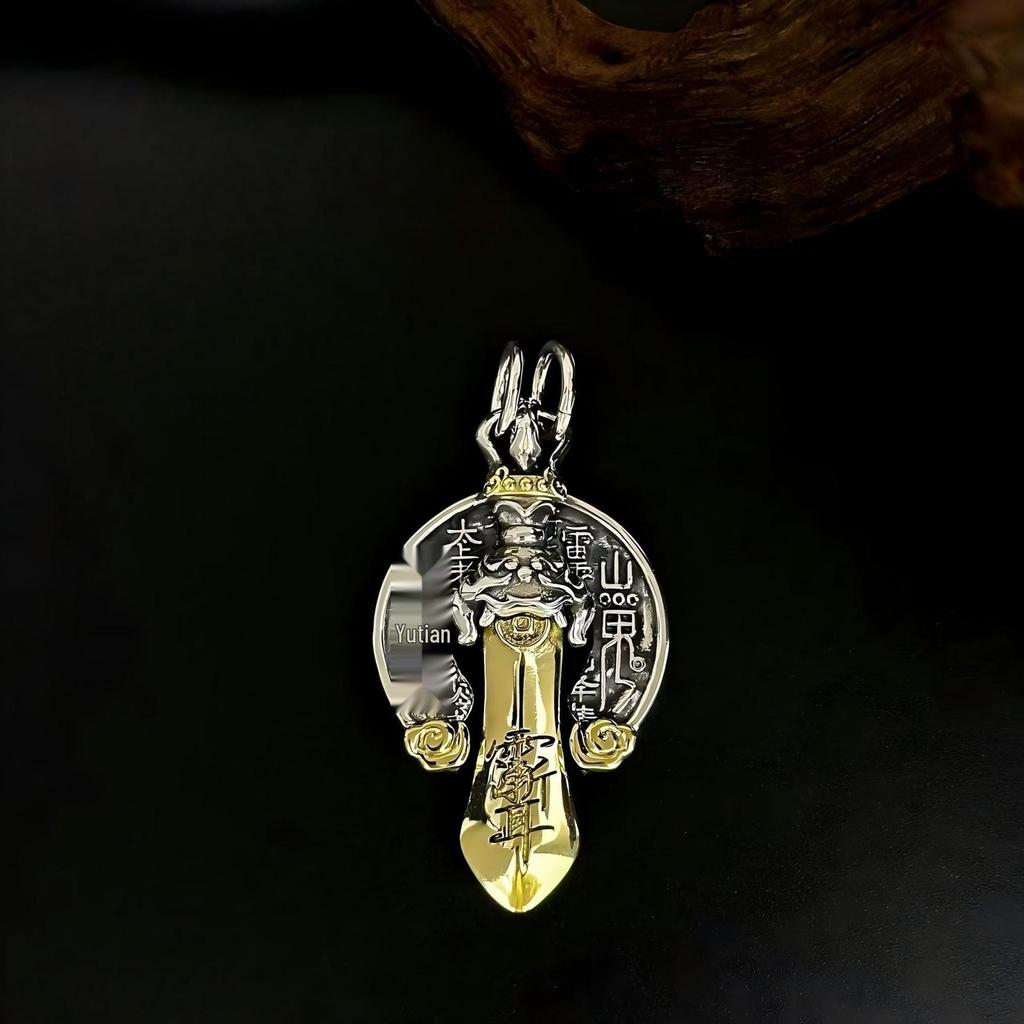 Přívěsek sedmibodý meč ze sterlingového stříbra S925 s taoistickou horskou duchovní mincí - thajské stříbro, niche design pro muže.