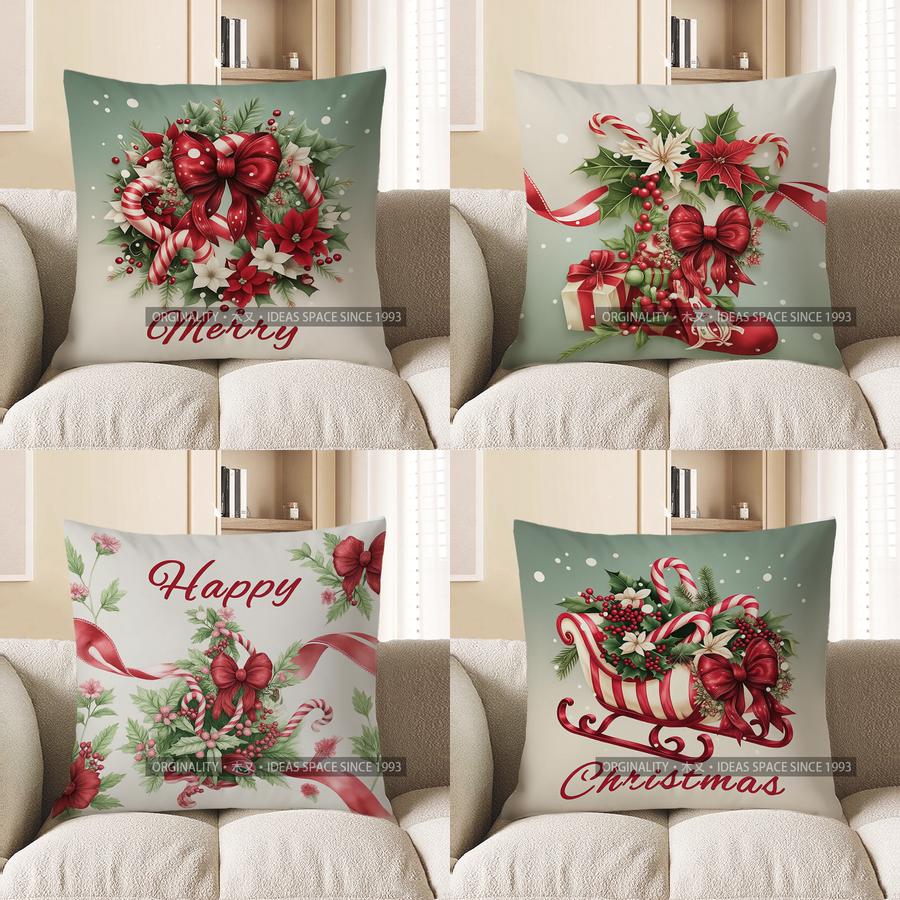 Home Decor Christmas Wreath With Candy Cane And Bow Pillow Pattern Cushion Cover Suitable For Sofa Bedroom Car Pillow Cover