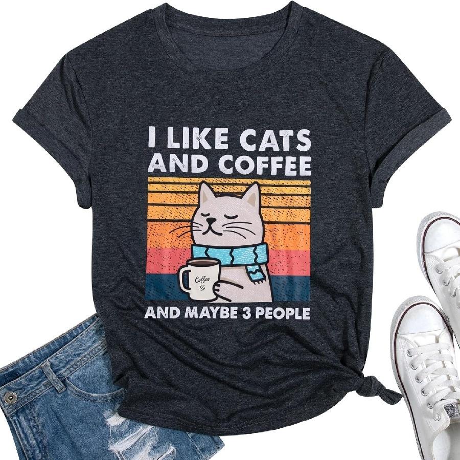 Cat Shirt Women_ I Like Cats and Coffee and Maybe 3 People Graphic Tee Vintage Cat Lover Gift Short Sleeve Tops