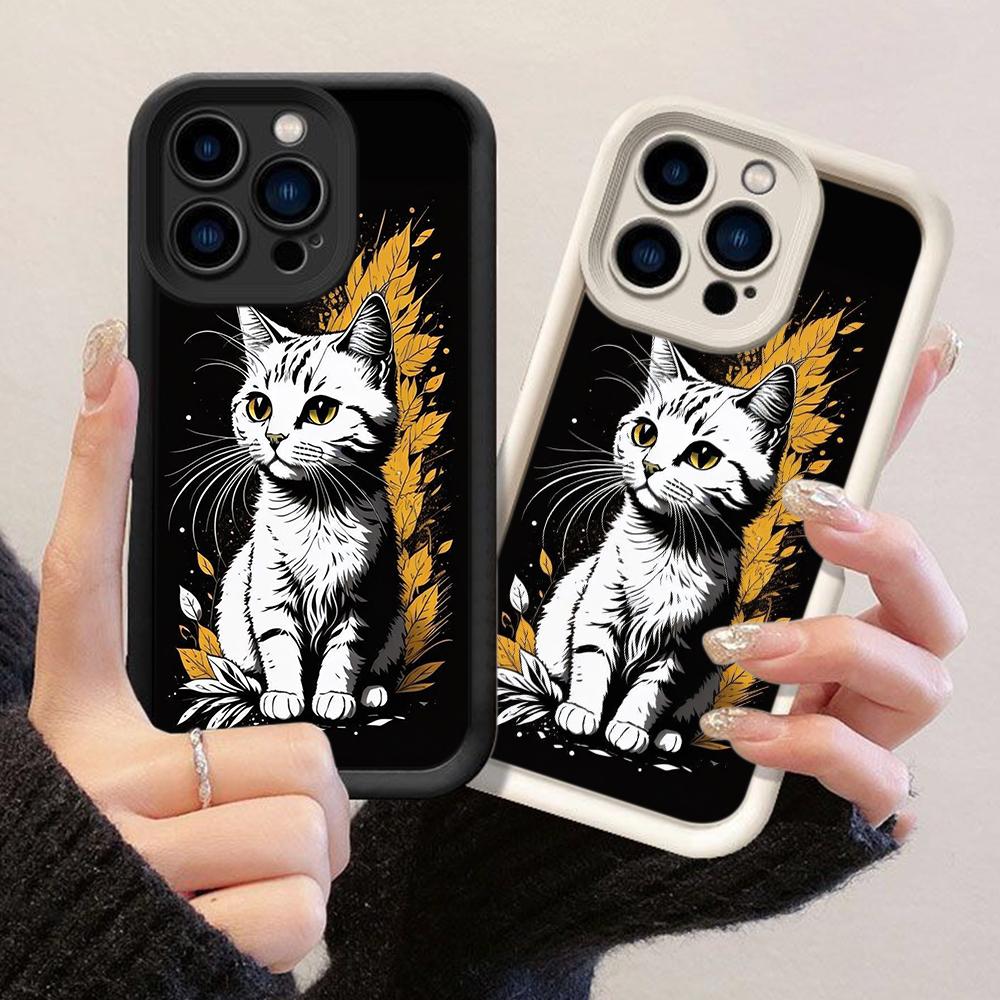 JT222 Cute white kitty art for iPhone 17 16 15 Pro Max Samsung S26 S25 Ultra A17 A16 A07 A56 A15 A06 Xiaomi 15T Redmi 15c 14C Soft TPU Case