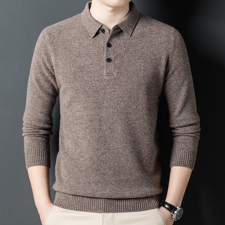 Introducing a sophisticated addition to your wardrobe, this men's sweater is crafted from 100% pure wool, offering both luxury and comfort. Designed for middle-aged business casual attire, the piece features a unique 9-pin lapel and a tailor neckline that exudes elegance. With a thickness of 430g, it serves as a perfect thickened base layer for cooler days. The plain knit design and long sleeves add to its refined, timeless appeal, making it an ideal choice for both professional and casual settings.