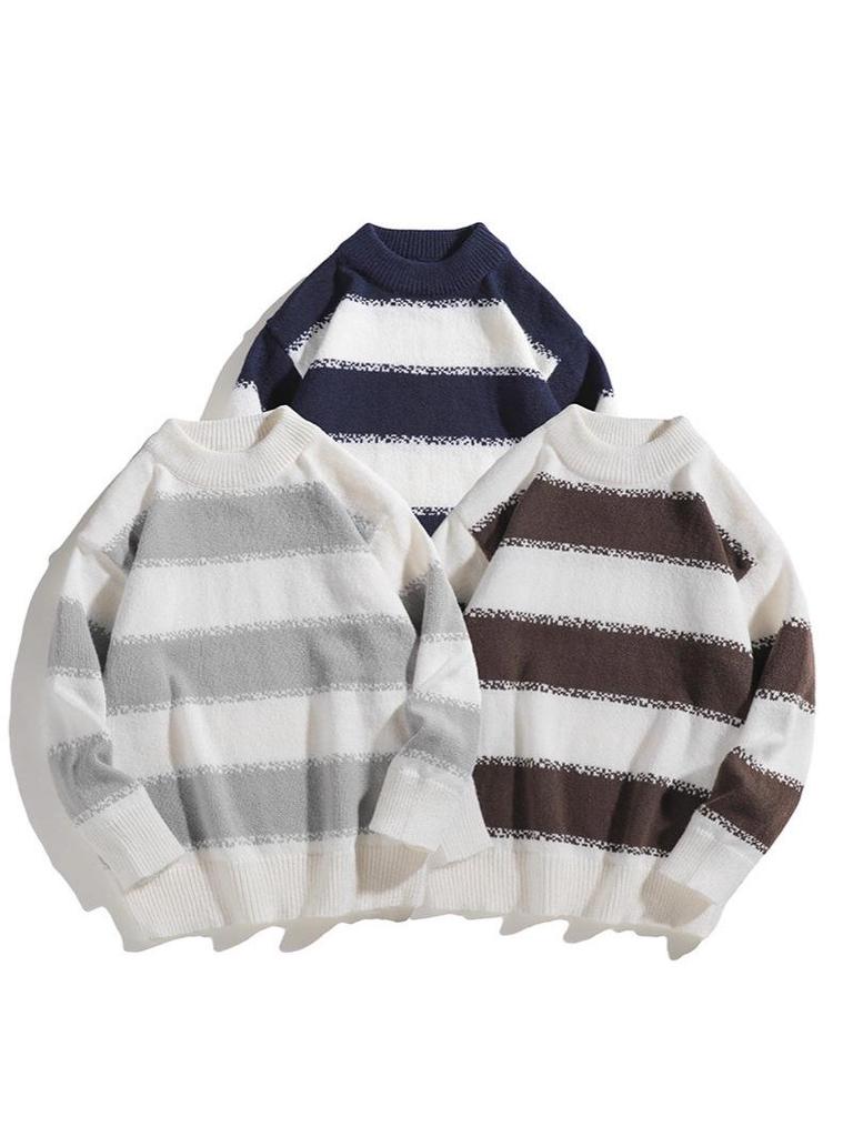 2025 Men's Japanese Casual Striped Knit Pullover - Autumn/Winter Loose Fit, Long Sleeve, Round Neck.