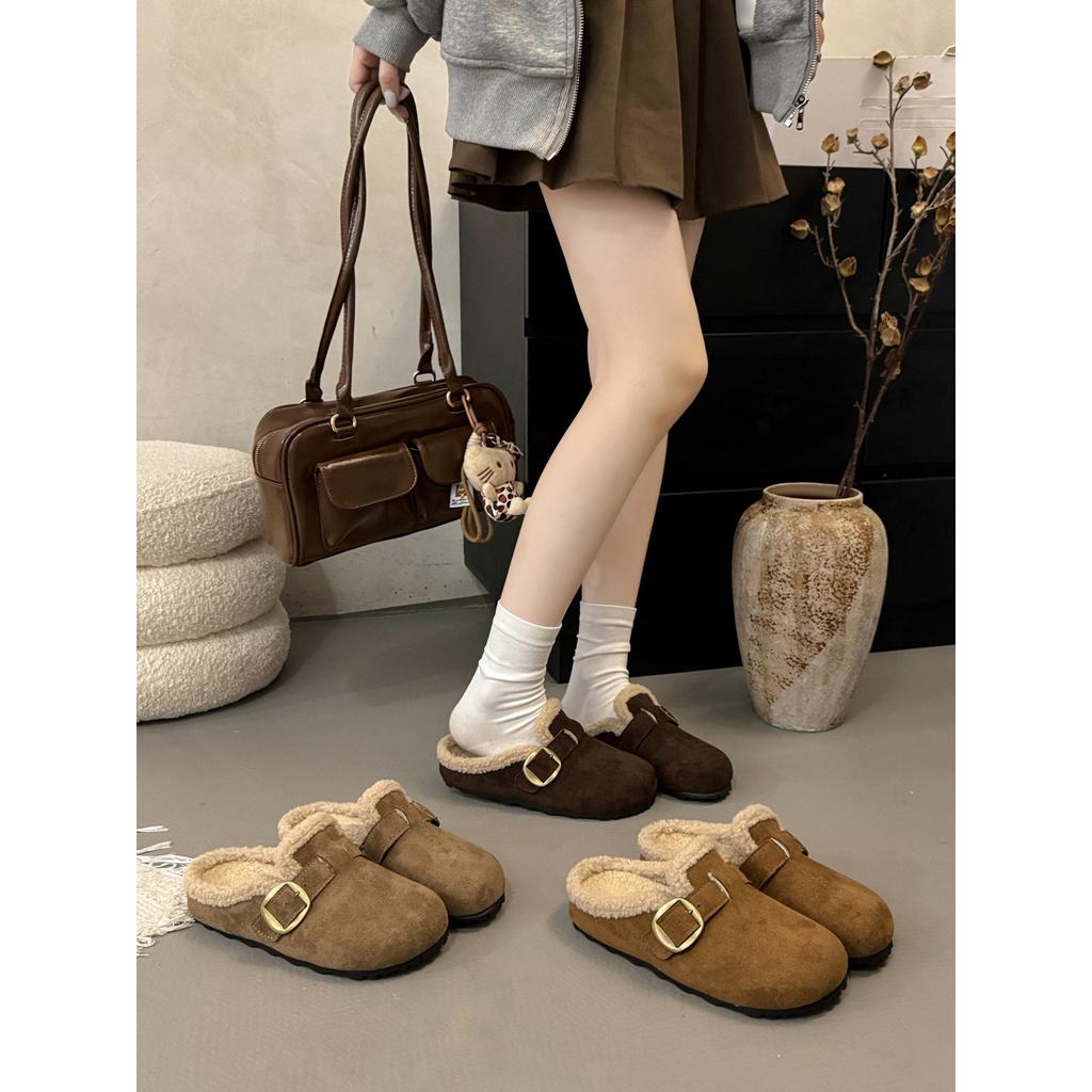 Brown retro heightened thick-soled piled half-drag Birkenstocks women's autumn and winter warm bag head cotton slippers