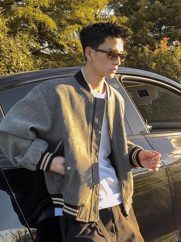 Men's Gray Woolen Bomber Jacket - Retro Baseball Style for Spring and Autumn