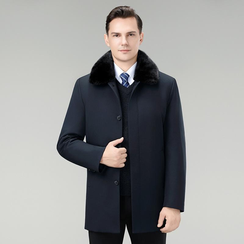 Introducing a sophisticated and functional outerwear piece designed for the modern, mature man. This insulated down jacket features a plush polyester mink fur collar for added warmth and style, ensuring both comfort and elegance during the colder months. Its solid pattern and tailored neckline provide a timeless and versatile look, perfect for autumn and winter. The jacket is filled with high-quality white duck down that offers excellent insulation against the cold, while the detachable liner adds versatility for changing weather conditions. Crafted with durable polyester material, this coat combines practical cold protection with tasteful design, making it an ideal choice for middle-aged men.