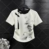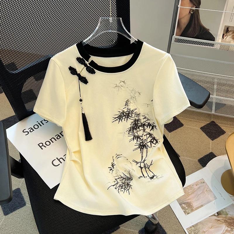 Cotton Chinese Style Women's T-shirt Summer Tees Short Sleeve Slim Women Tops Vintage O-necks Embroidery Korean Clothing Sales