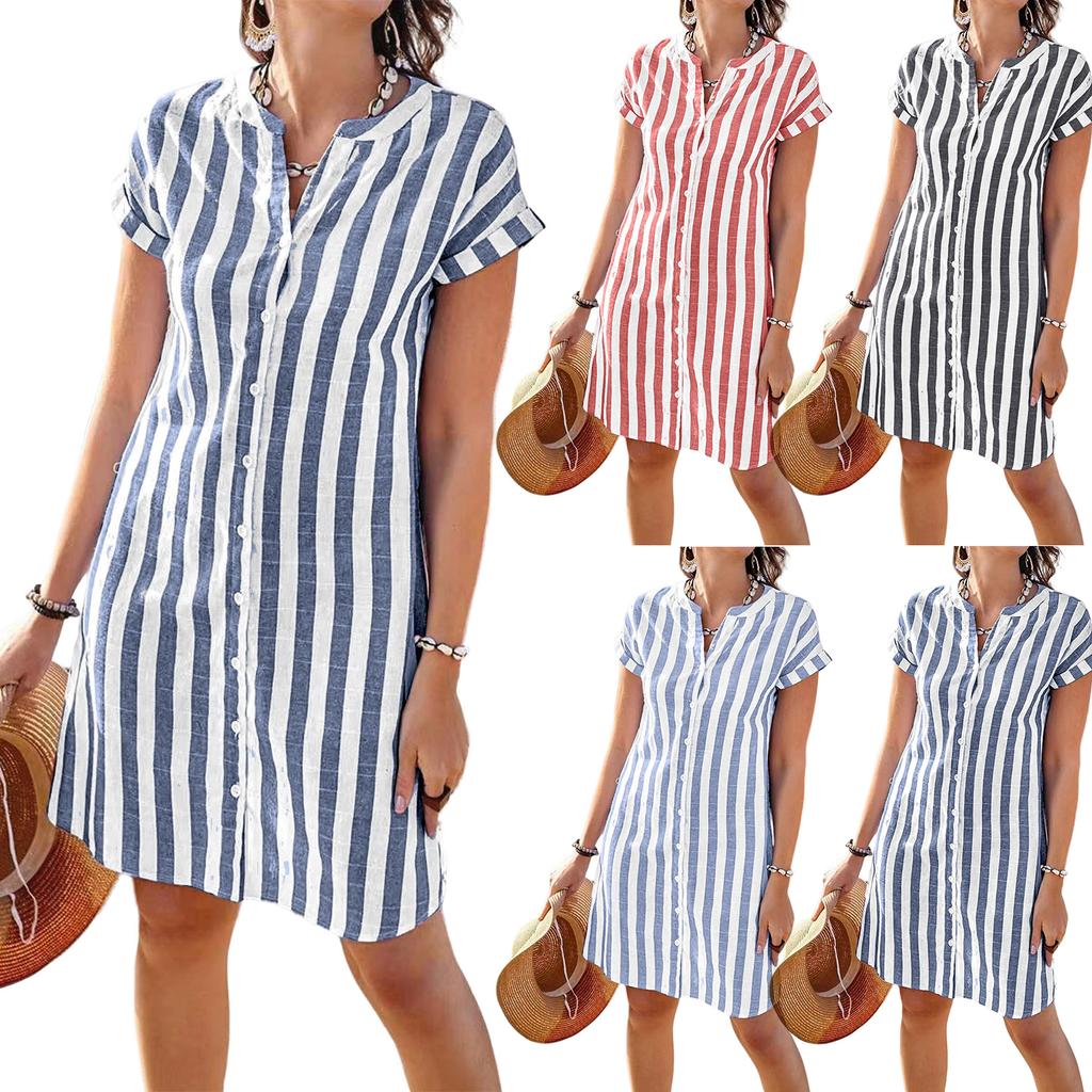 Dámské ležérní bavlněné a lněné pruhované tištěné šaty s krátkým rukávem