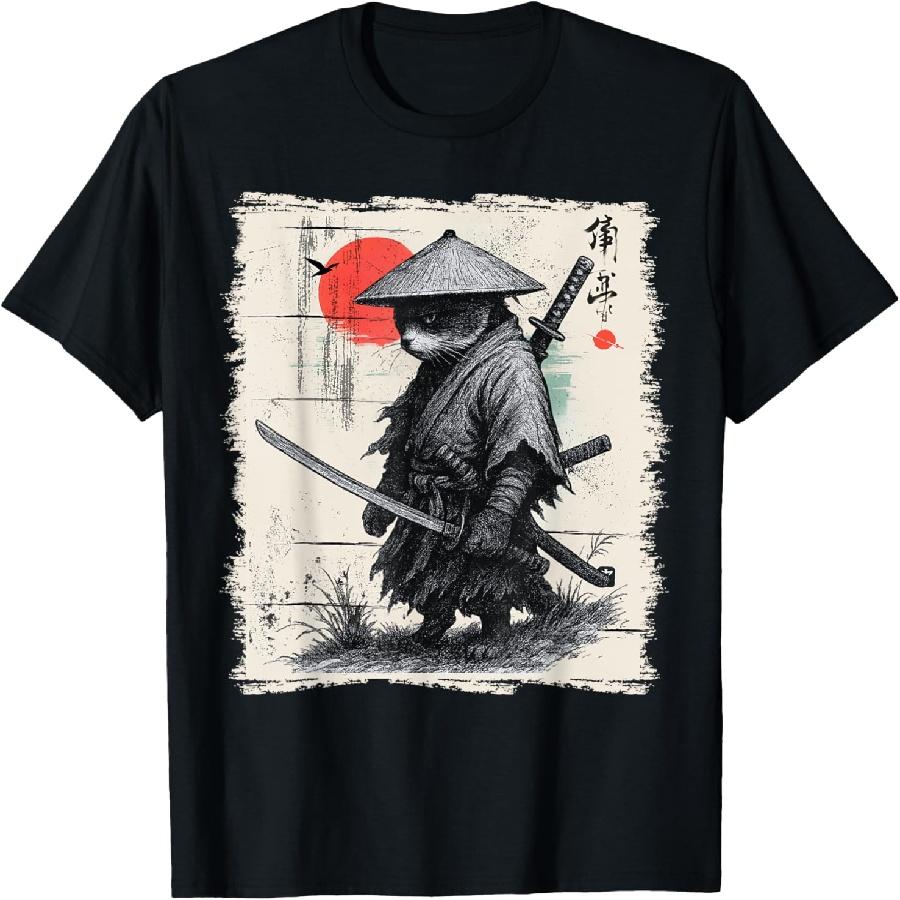 Samurai Cat Warrior Ukiyo Ink Japanese Vintage Samurai Cat T-Shirt for Men Women Kids