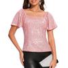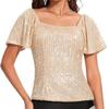 2026 Women's Fashionable Short Sleeve Blouse Square Neck Sequin Puff Sleeve Versatile Glamorous Blouses with Sequins and Puff Sleeves