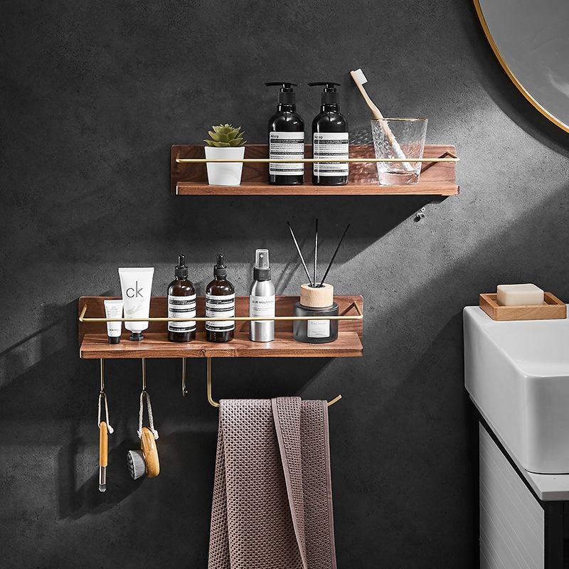 Solid Wood Bathroom Shelf Wall Mounted Toilet Storage Rack Towel Rack Toiletry Counter Bathroom Makeup Storage Rack Hook Bar