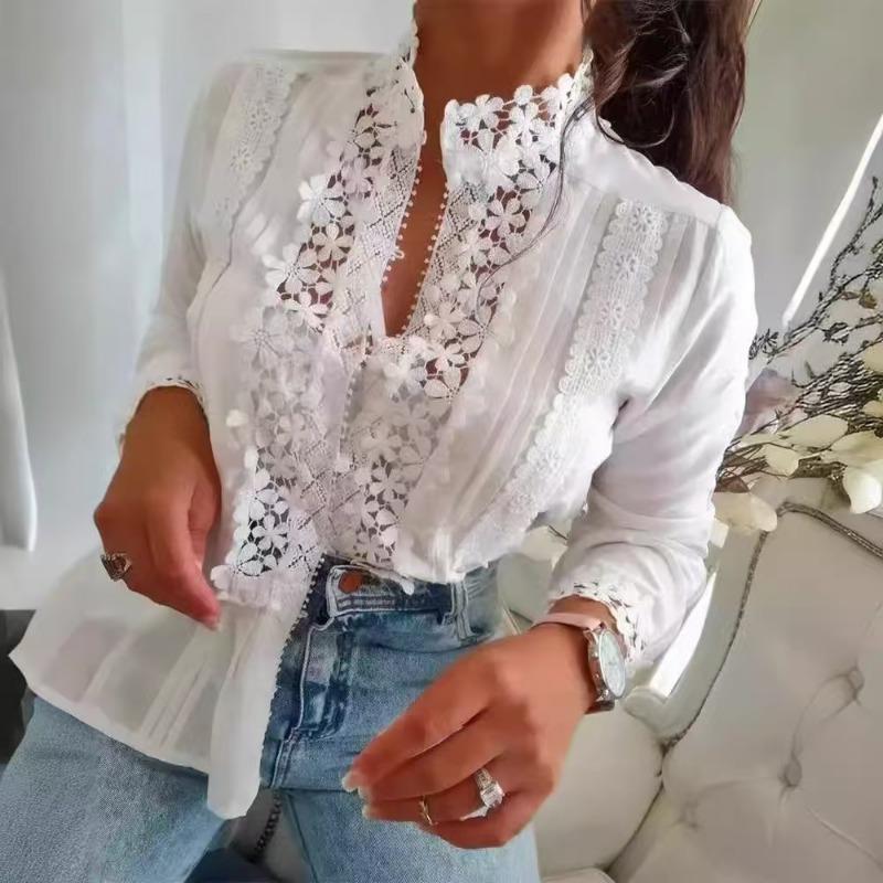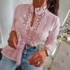 Spring Autumn Sweet Lace Stitching Women Shirt Loose Casual Office Blouse Long Sleeve Stand Collar Elegant Sexy Hollow Out Crochet Top Simple Clothes