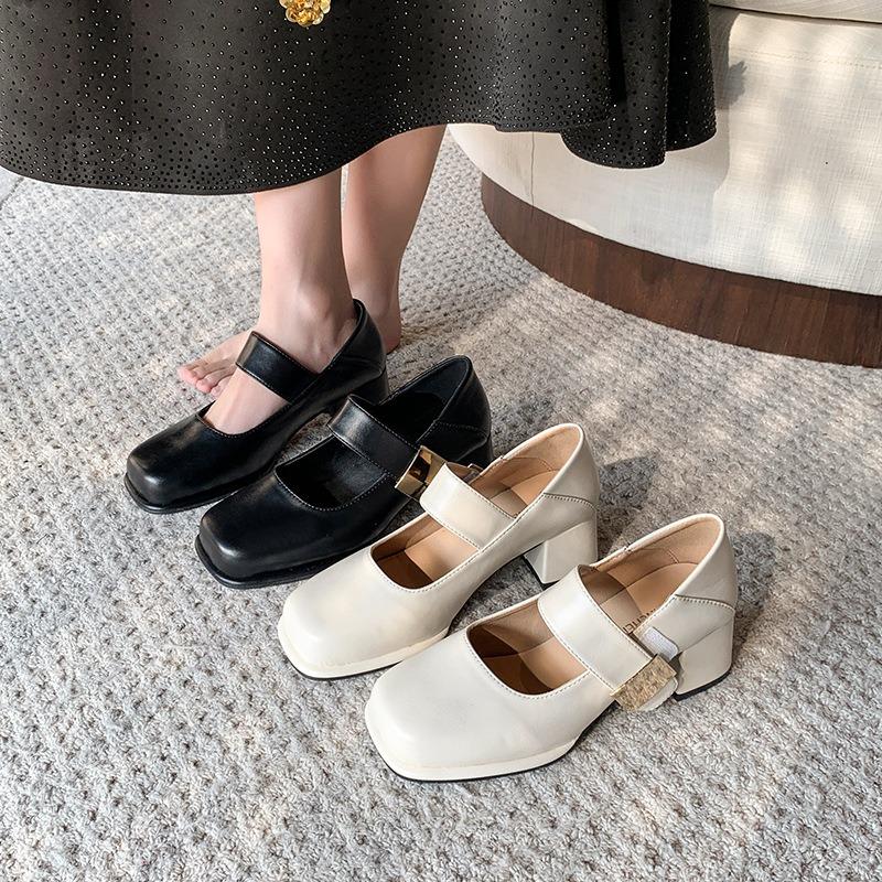 Square head thick heel retro Mary Jane shoes spring new one-word temperament small leather shoes spring single shoes women