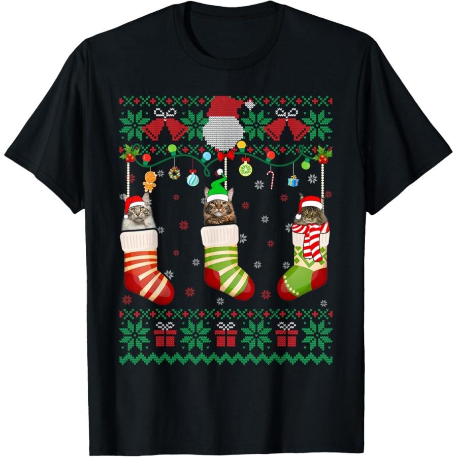 Retro Funny Merry Catmas Maine Coon Cat Ugly Christmas Cat T-Shirt for Men Women Kids