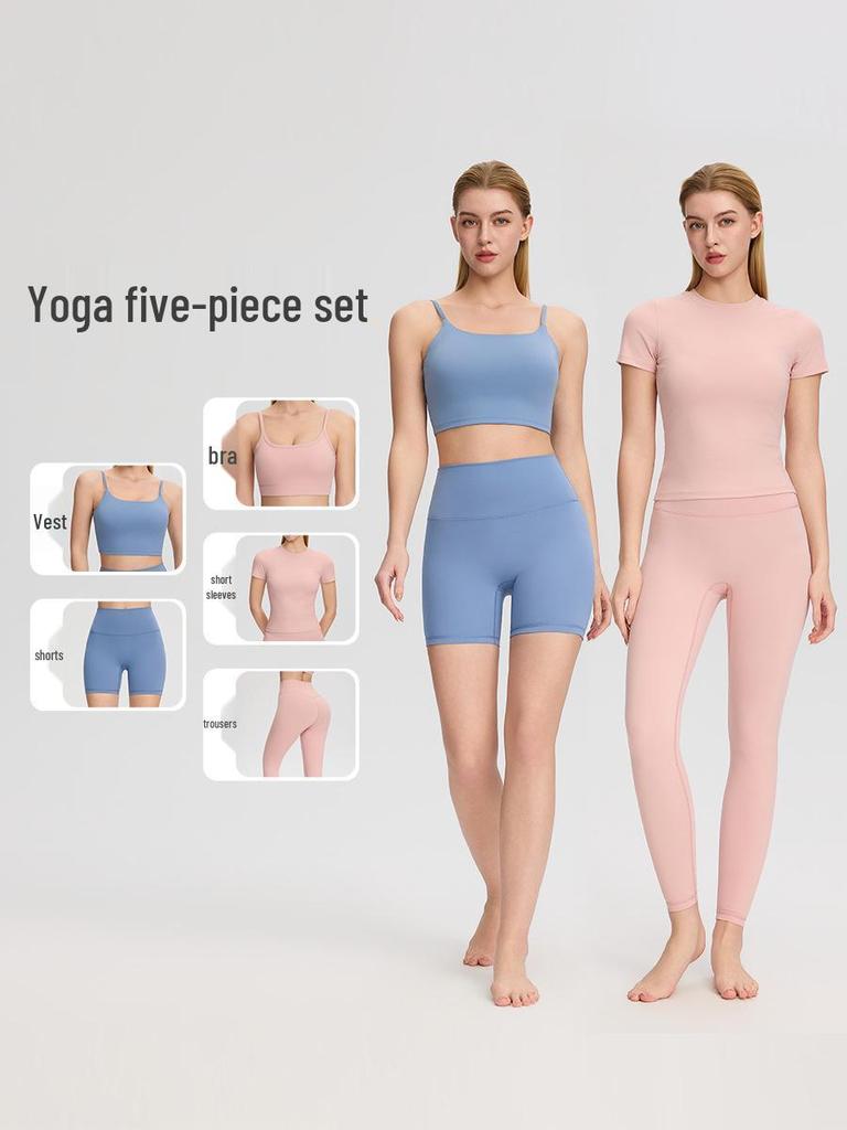 Bare-Feel Five-Piece Yoga Set: Long & Short Sleeve Tops, Chest Pads, Tight Slimming High-Waisted Pants.