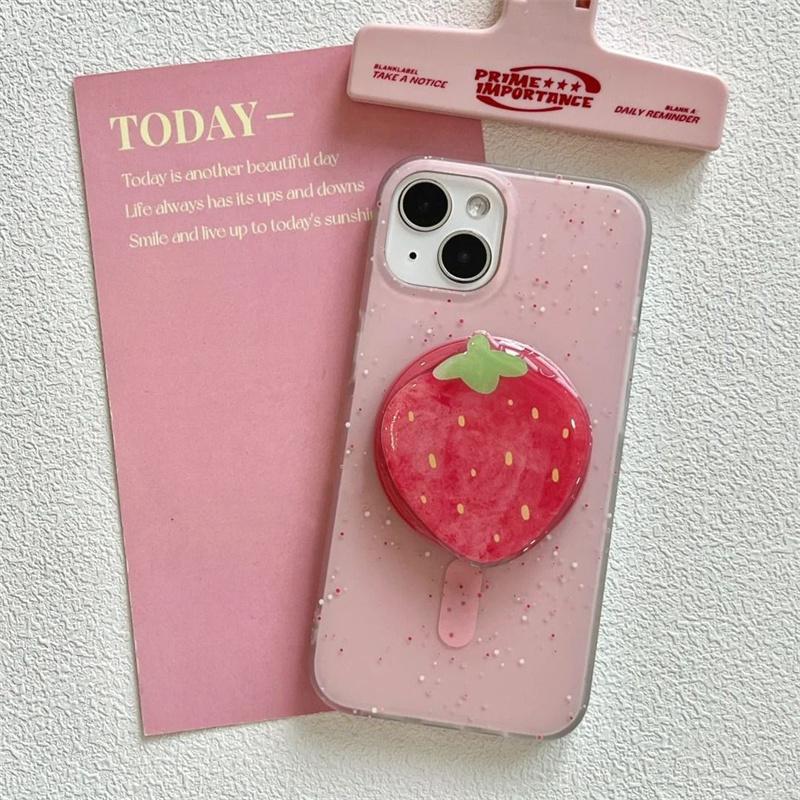 Růžovočervený a bílý inkoustem postříkaný kryt na telefon s magnetickým držákem ve tvaru jahody Pro iPhone 11 12 13 14 15 16 17 pro max