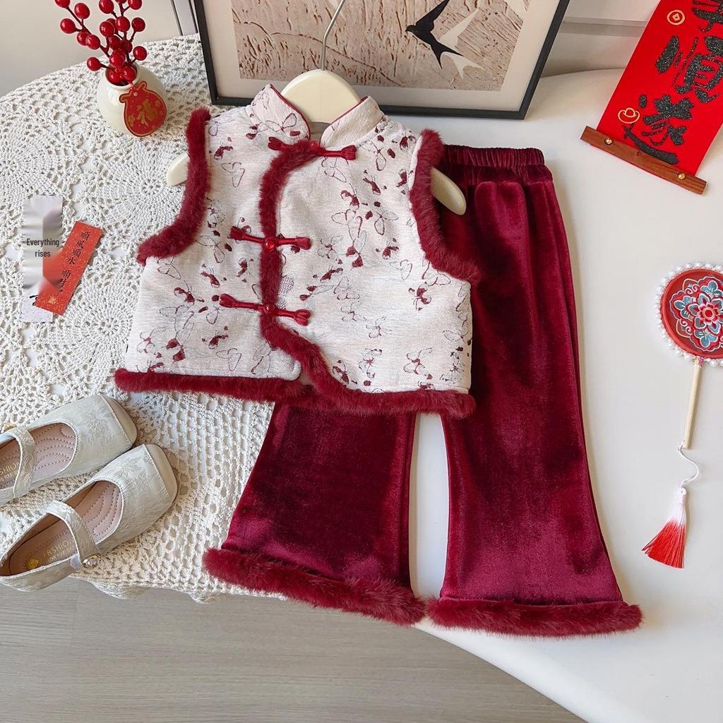 New Winter Arrival: Baby Girls' Chinese Style Fleece-Lined Vest & Long Pants Set - AWB138.