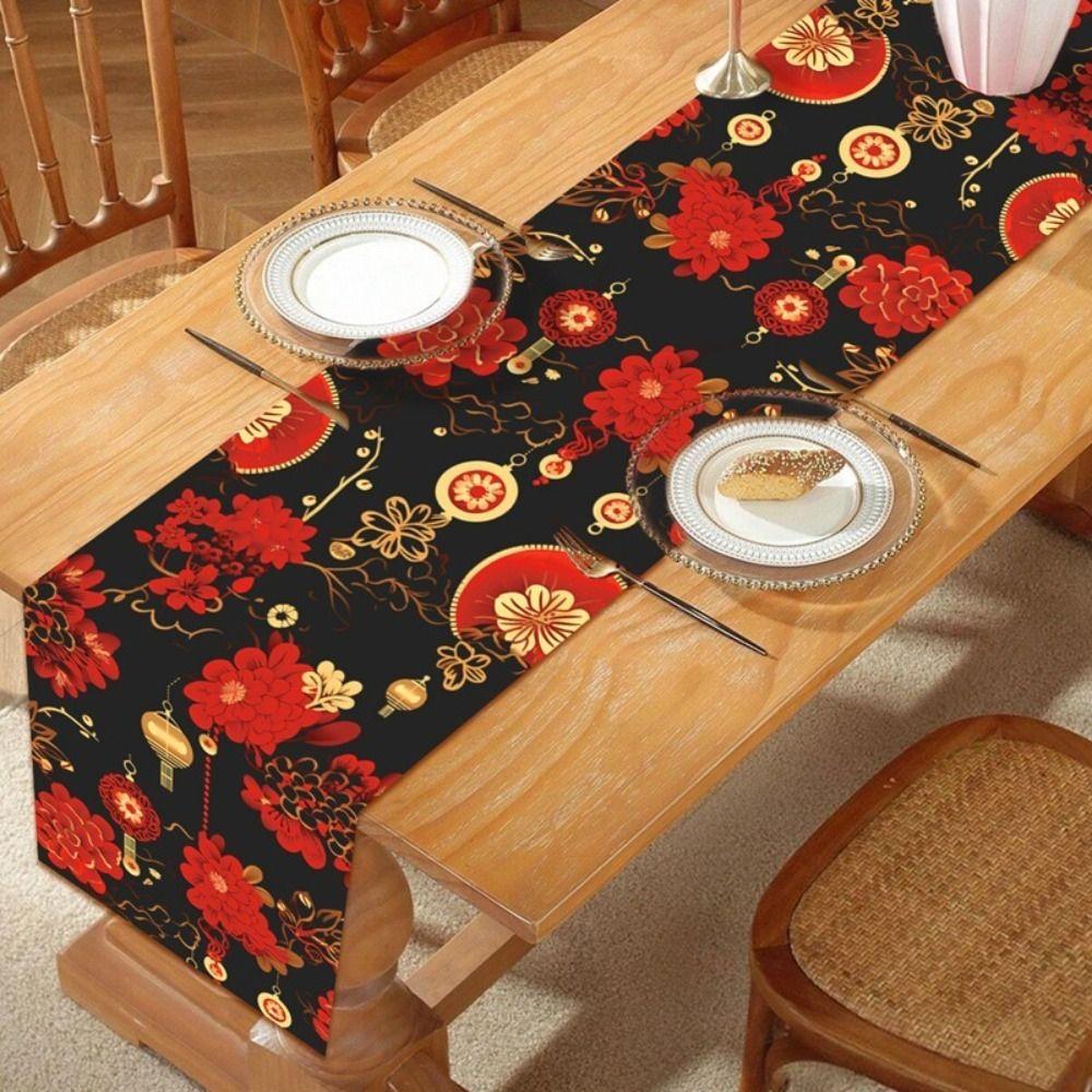 Red Golden Color New Year Table Runner Lantern Print Rectangular Shape Table Runner Horse Design Table Flag Festival Celebration