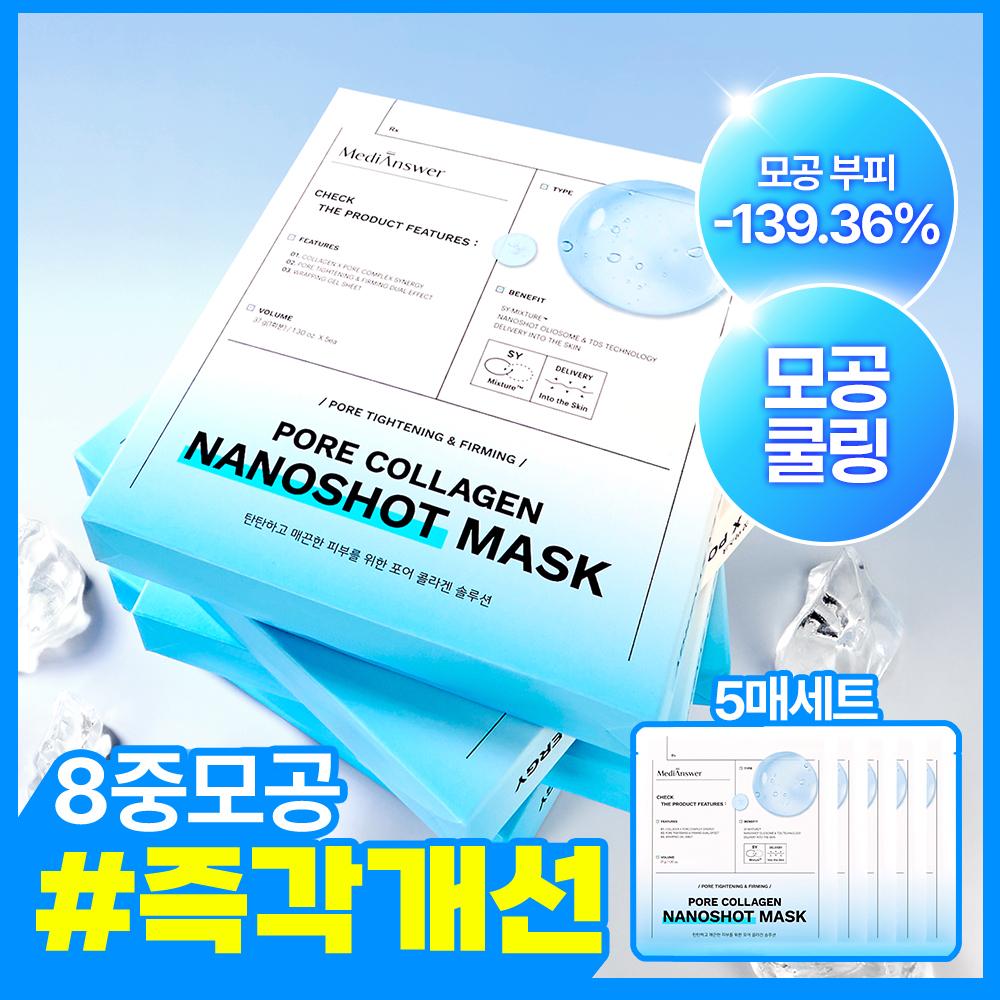 Medionnser Pore Collagen Nano Shot Mask 5 sheets is a hydrogel sheet mask designed for pore elasticity improvement. This product addresses both skin elasticity and pore concerns, and 83% high-concentration collagen extract helps firm the skin. It combines 500Da collagen extract and clay, along with patented ingredients for pore and sebum control, providing hydration and elasticity enhancement. Suitable for all skin types, this mask also boasts dual functionalities for whitening and wrinkle improvement.
