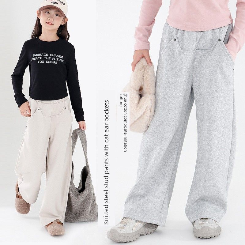 Girls' Sports Pants, Spring and Autumn Children's Clothing, Loose Wide-Leg Pants for Kids, Casual Solid Color Mid-Waist Pants for Older Children